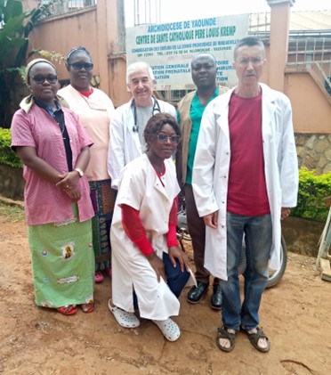 Foto: Los voluntarios, Dr. Miguel Ángel Sauras y Dr. Javier Sánchez Ayuso junto al personal del Centro de Salud Católico Louis Kremp.